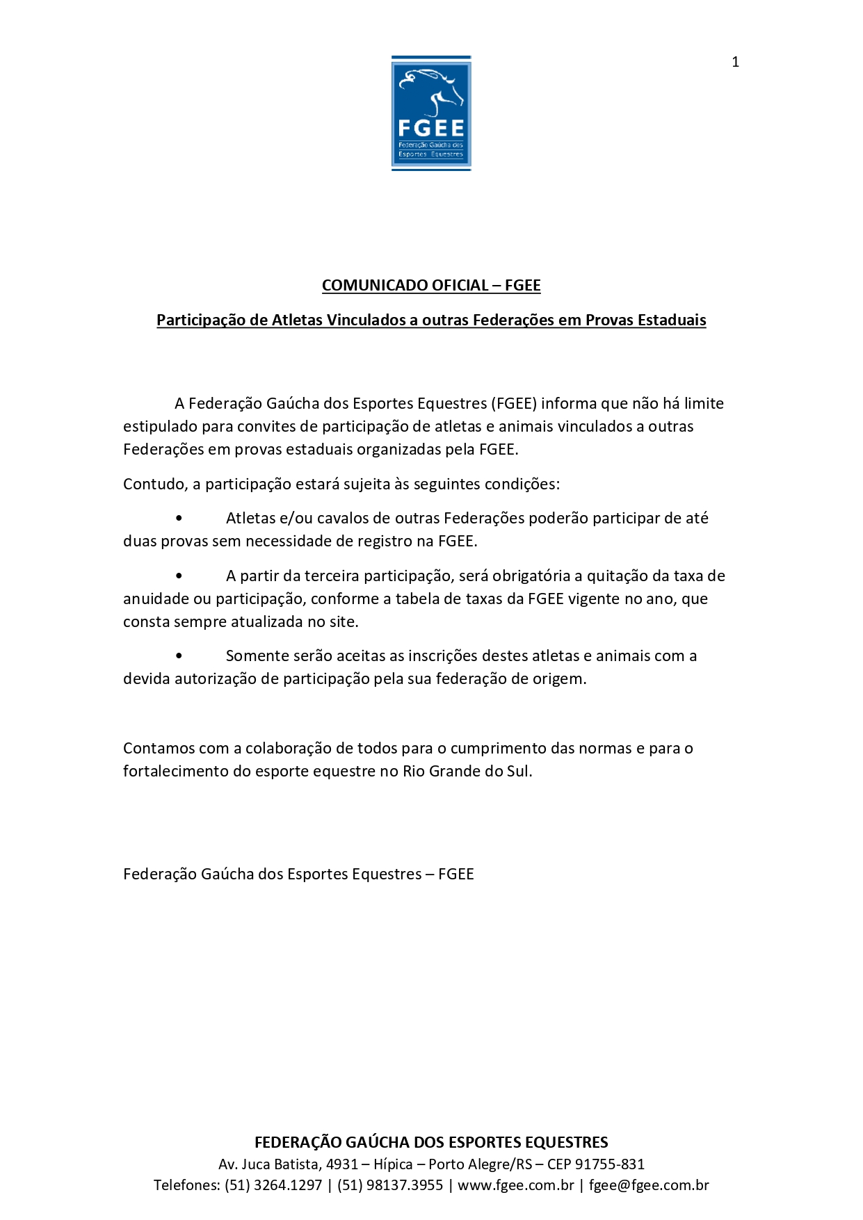 A Federação Gaúcha dos Esportes Equestres (FGEE) informa que não há limite estipulado para convites de participação de atletas e animais vinculados a outras Federações em provas estaduais organizadas pela FGEE. Post publicado:13 de agosto de 2025 Categoria do post:Salto